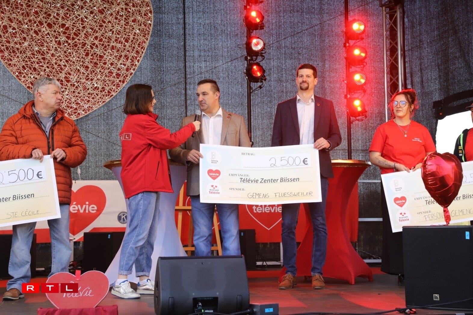 During the big Télévie day last Saturday in Bissen, the cheque from the municipality of Flaxweiler, amounting to 2.500 €, was also presented. This amount is based on the proceeds from the public festival held as part of the municipal partnership celebrations with the municipality of Reinsdorf on May 3rd, 2025. At its meeting on June 24th, 2025, the municipal council decided to donate these proceeds to Télévie.